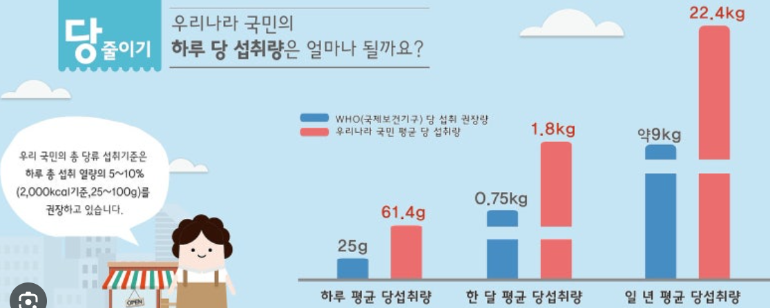 미국심장협회 기준(25g/일) 또는 WHO 기준(48g/일)을 목표로 하세요: